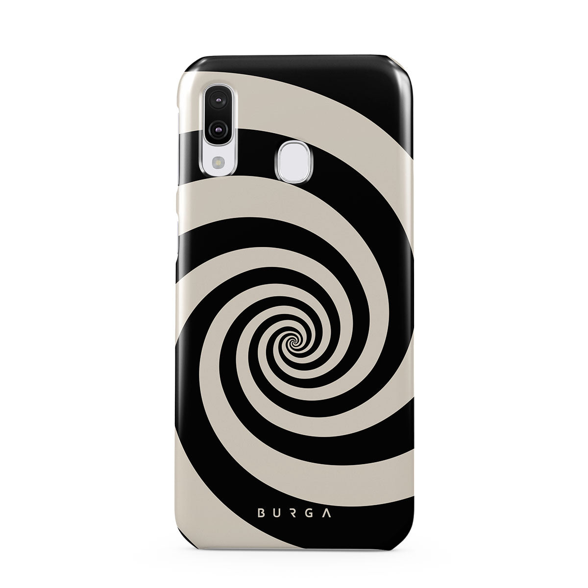 En este diseño: espiral blanco y negro, patrón hipnótico.