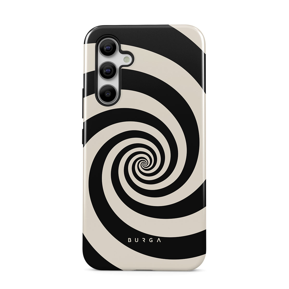 En este diseño: espiral blanco y negro, patrón hipnótico.
