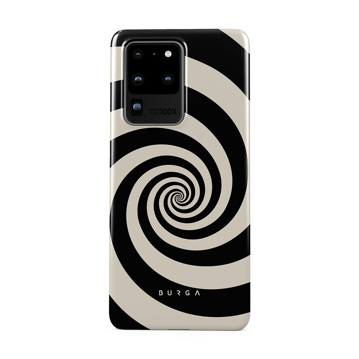 En este diseño: espiral blanco y negro, patrón hipnótico.