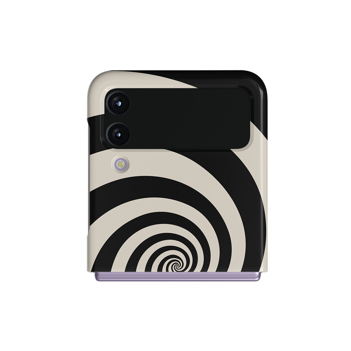 En este diseño: espiral blanco y negro, patrón hipnótico.