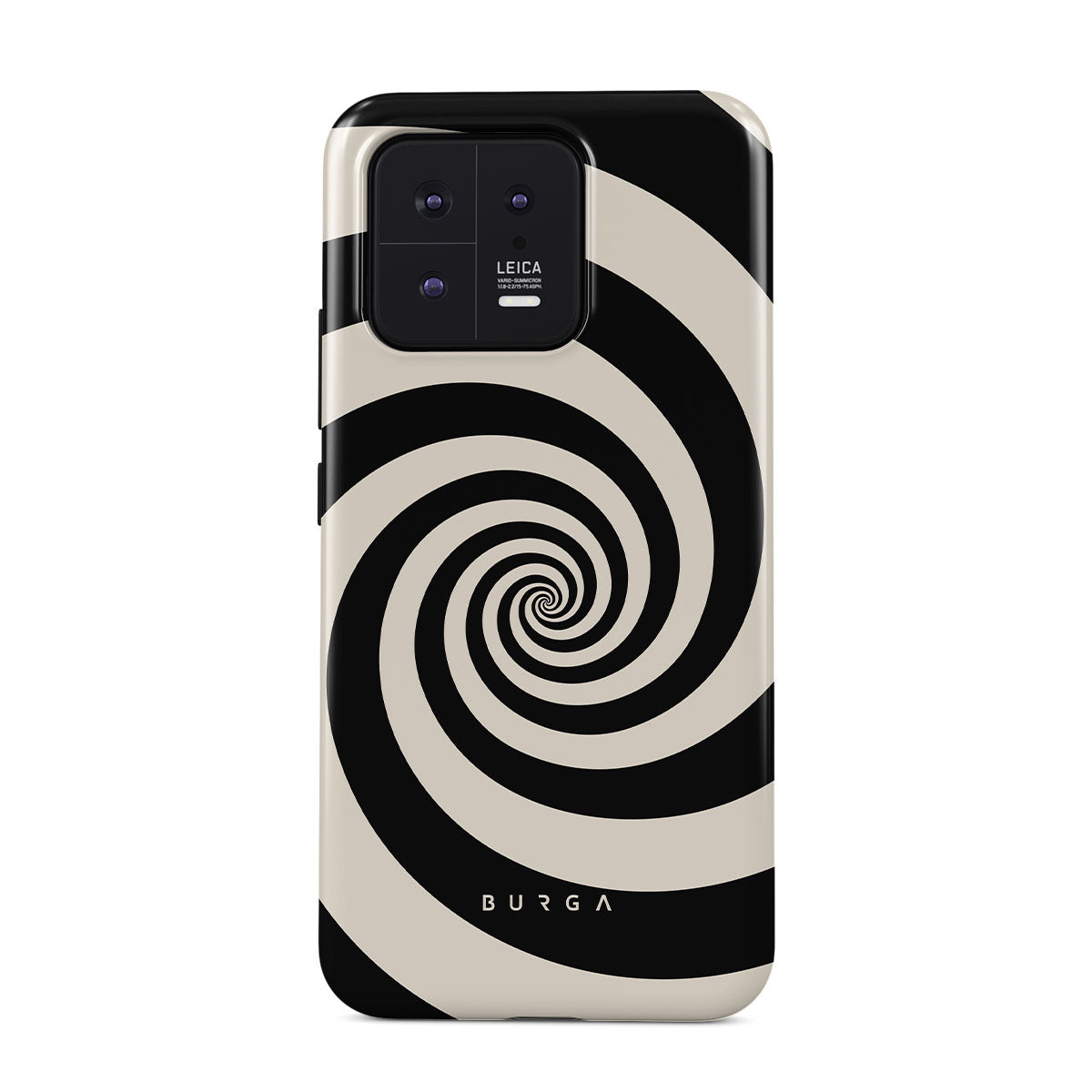 En este diseño: espiral blanco y negro, patrón hipnótico.