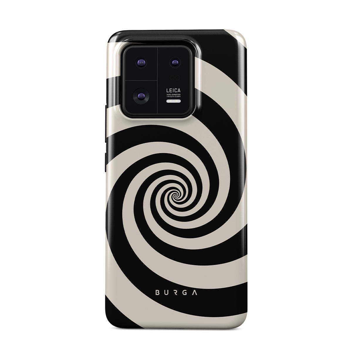 En este diseño: espiral blanco y negro, patrón hipnótico.