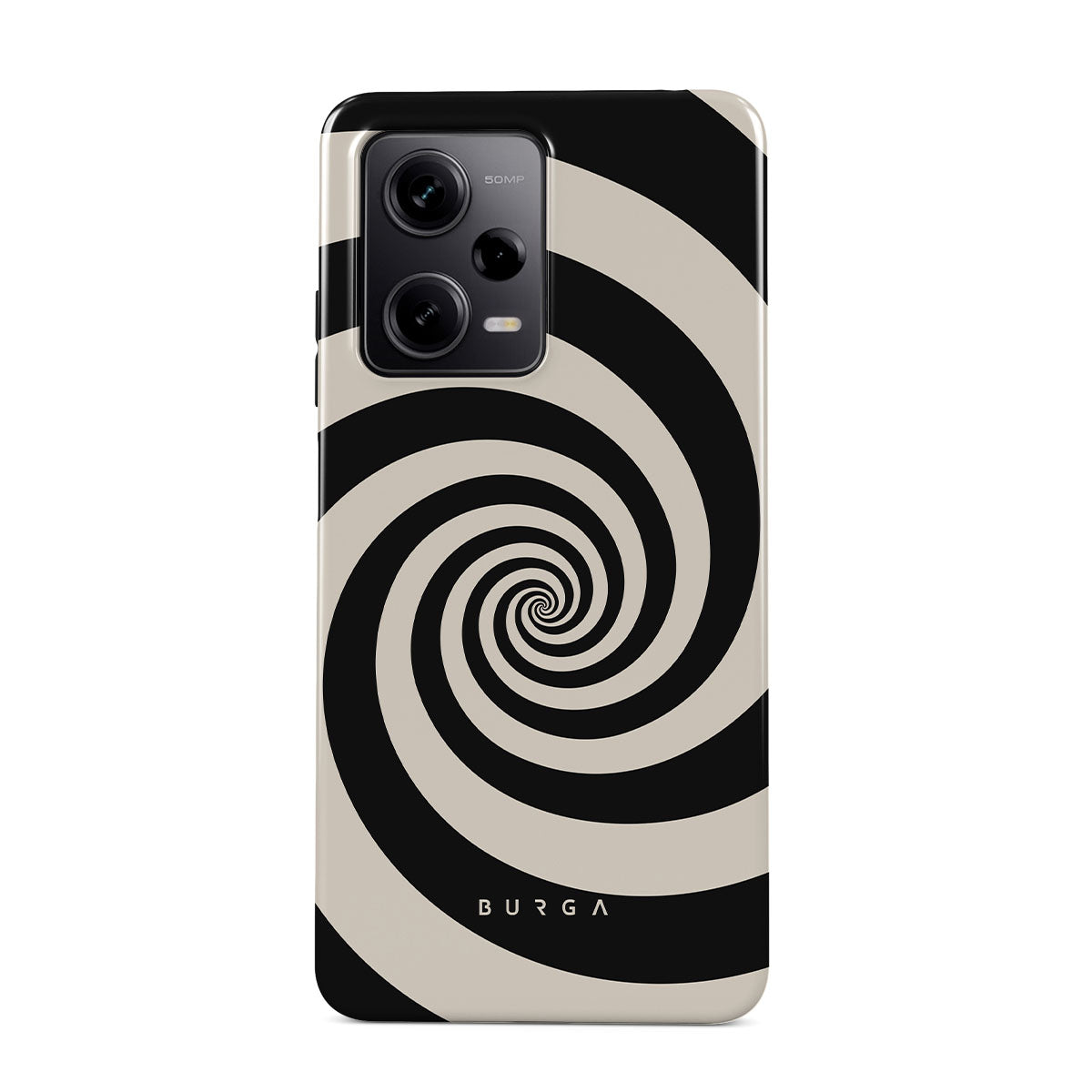 En este diseño: espiral blanco y negro, patrón hipnótico.
