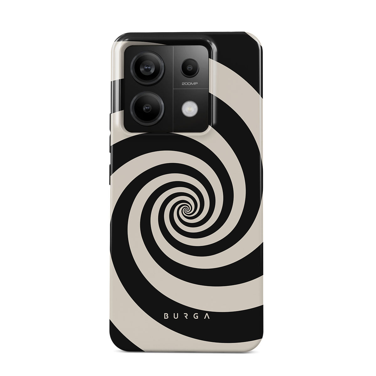 En este diseño: espiral blanco y negro, patrón hipnótico.