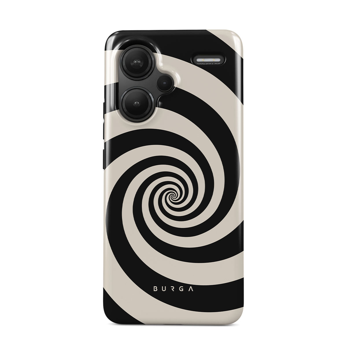En este diseño: espiral blanco y negro, patrón hipnótico.