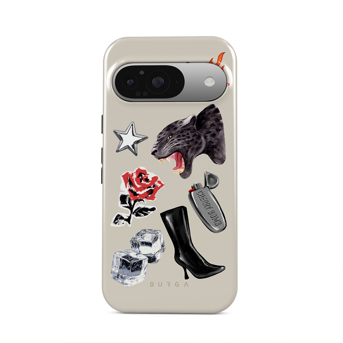 En este diseño: pantera negra, rosa roja, pimiento ardiendo, encendedor plateado, botas negras altas, cubitos de hielo, estrella plateada.
