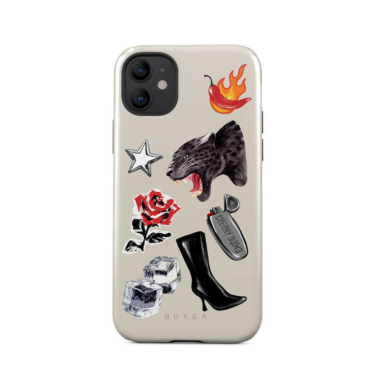 En este diseño: pantera negra, rosa roja, pimiento ardiendo, encendedor plateado, botas negras altas, cubitos de hielo, estrella plateada.