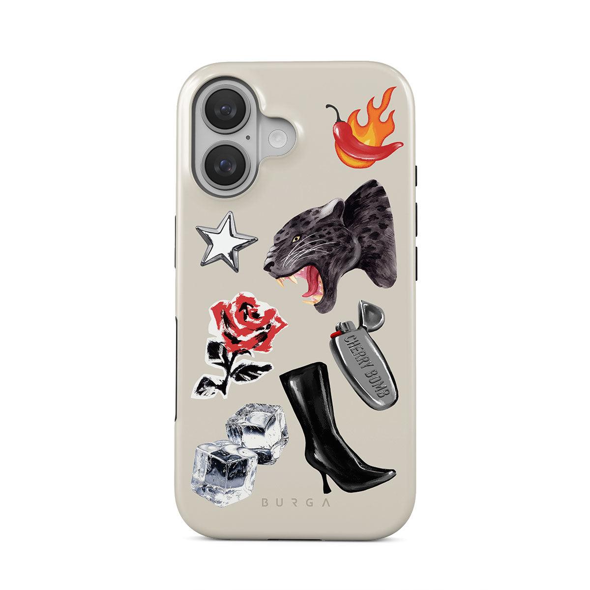 En este diseño: pantera negra, rosa roja, pimiento ardiendo, encendedor plateado, botas negras altas, cubitos de hielo, estrella plateada.