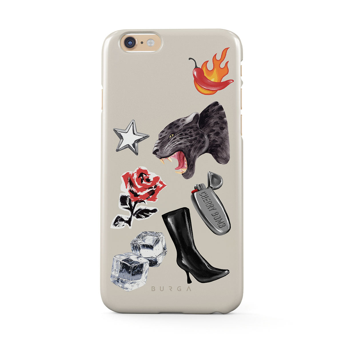 En este diseño: pantera negra, rosa roja, pimiento ardiendo, encendedor plateado, botas negras altas, cubitos de hielo, estrella plateada.