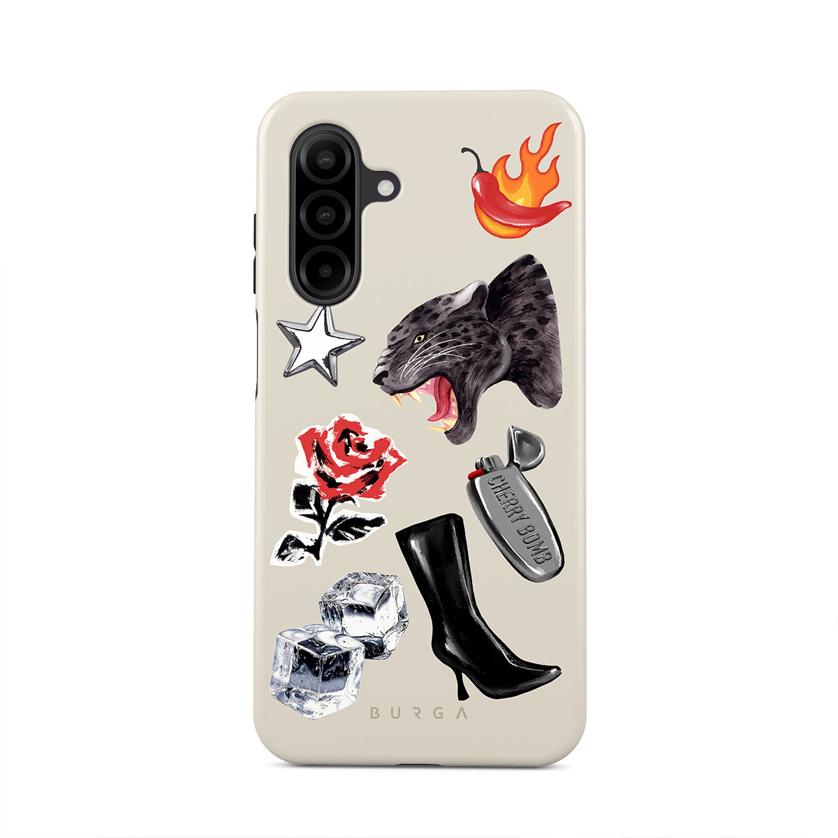 En este diseño: pantera negra, rosa roja, pimiento ardiendo, encendedor plateado, botas negras altas, cubitos de hielo, estrella plateada.