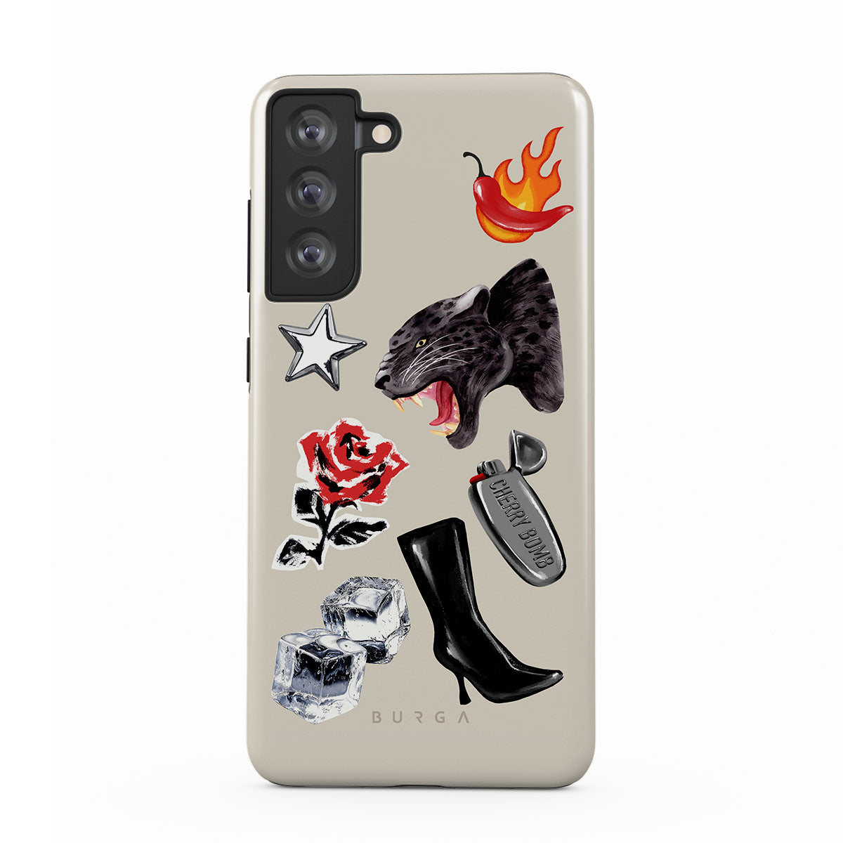 En este diseño: pantera negra, rosa roja, pimiento ardiendo, encendedor plateado, botas negras altas, cubitos de hielo, estrella plateada.