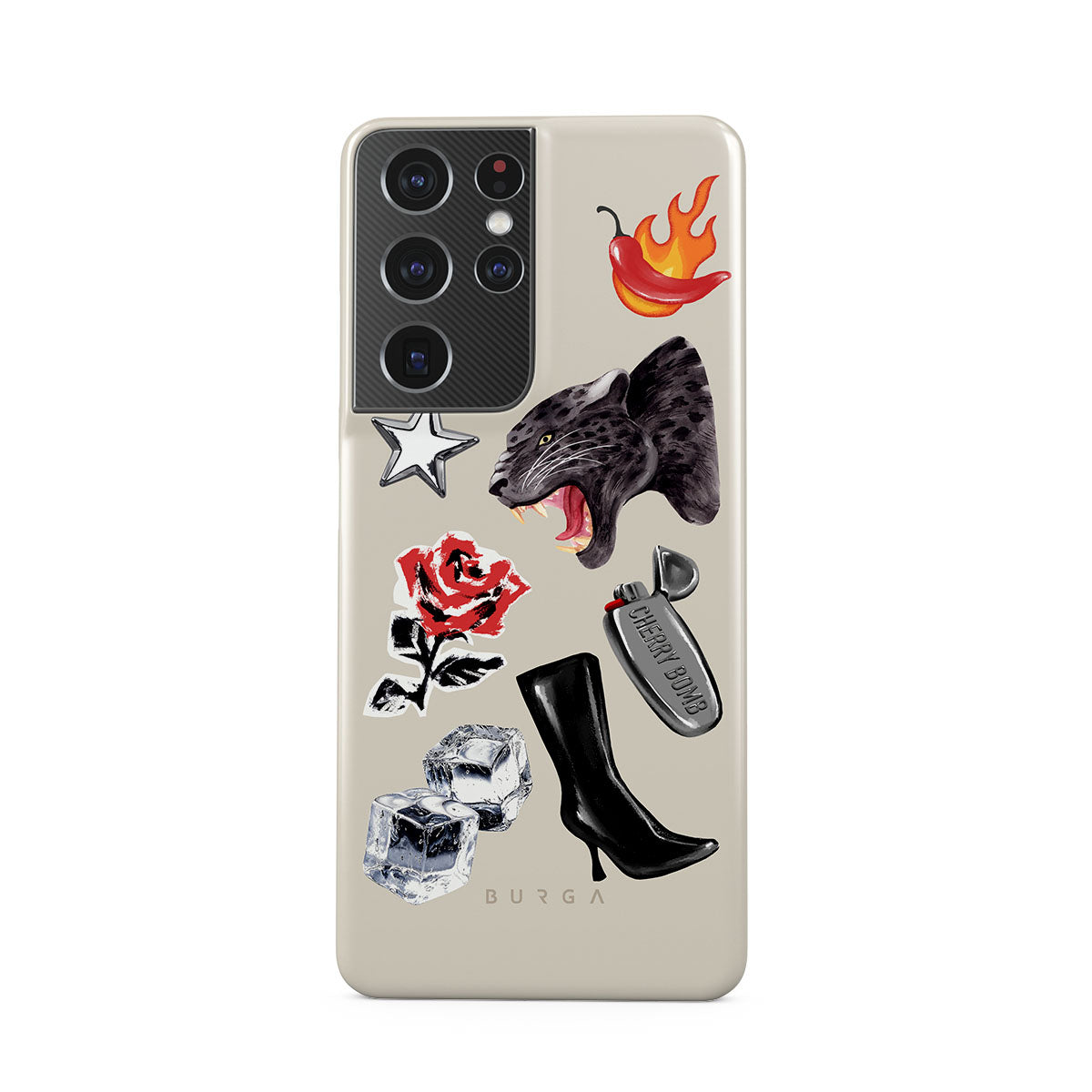 En este diseño: pantera negra, rosa roja, pimiento ardiendo, encendedor plateado, botas negras altas, cubitos de hielo, estrella plateada.