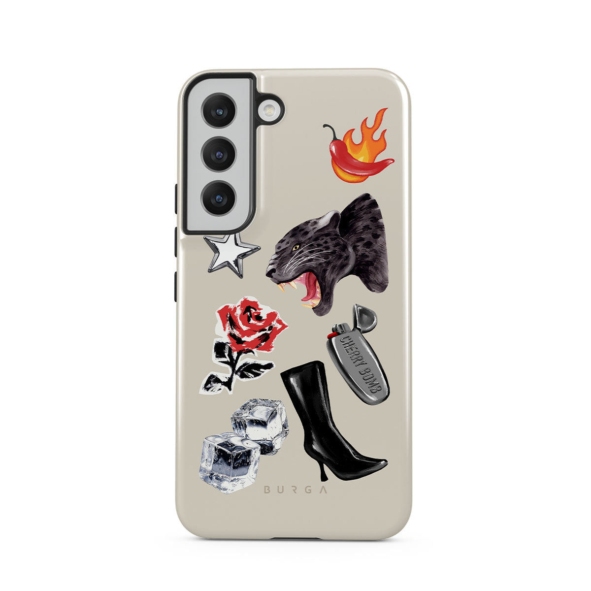 En este diseño: pantera negra, rosa roja, pimiento ardiendo, encendedor plateado, botas negras altas, cubitos de hielo, estrella plateada.