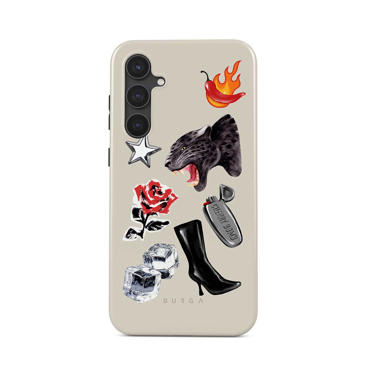 En este diseño: pantera negra, rosa roja, pimiento ardiendo, encendedor plateado, botas negras altas, cubitos de hielo, estrella plateada.