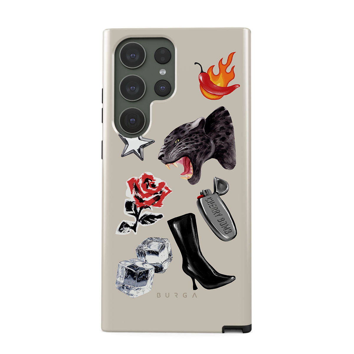 En este diseño: pantera negra, rosa roja, pimiento ardiendo, encendedor plateado, botas negras altas, cubitos de hielo, estrella plateada.