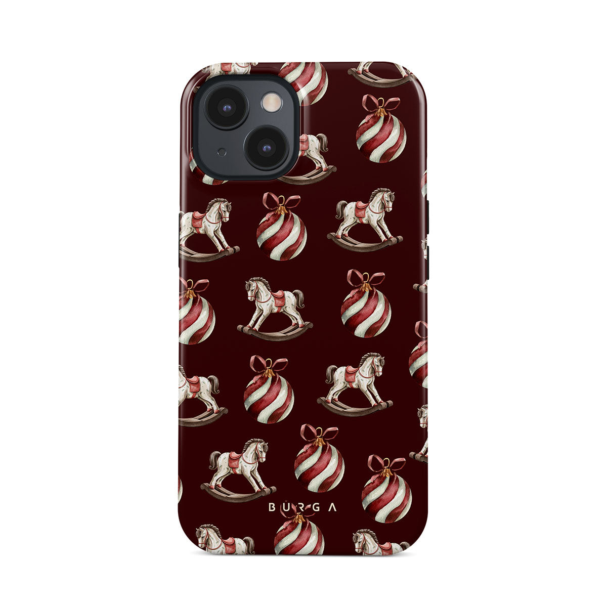 El diseño presenta: caballitos balancín, bolas de Navidad, rojo, decoración navideña.