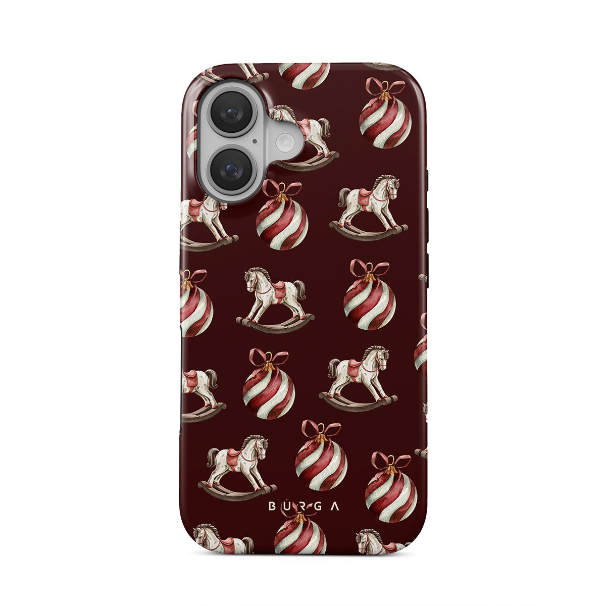 El diseño presenta: caballitos balancín, bolas de Navidad, rojo, decoración navideña.