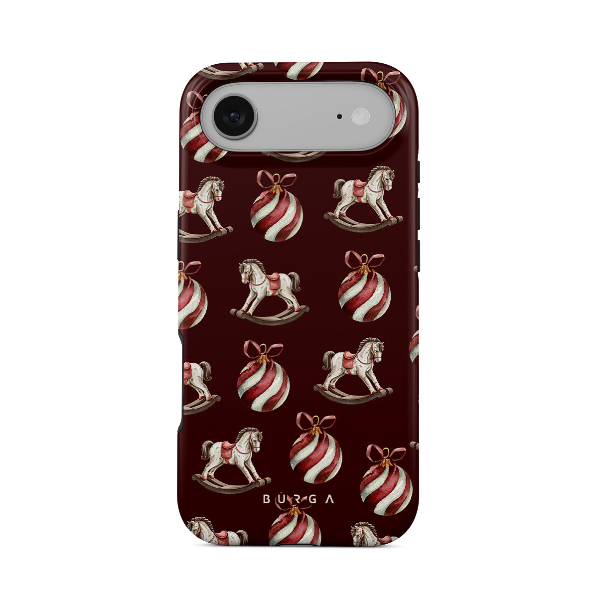 El diseño presenta: caballitos balancín, bolas de Navidad, rojo, decoración navideña.