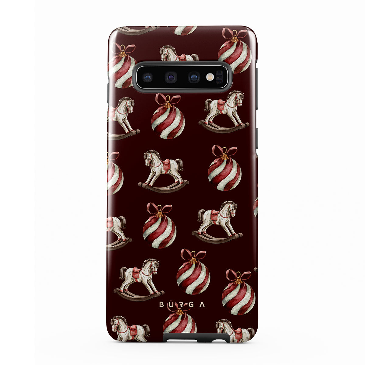 El diseño presenta: caballitos balancín, bolas de Navidad, rojo, decoración navideña.