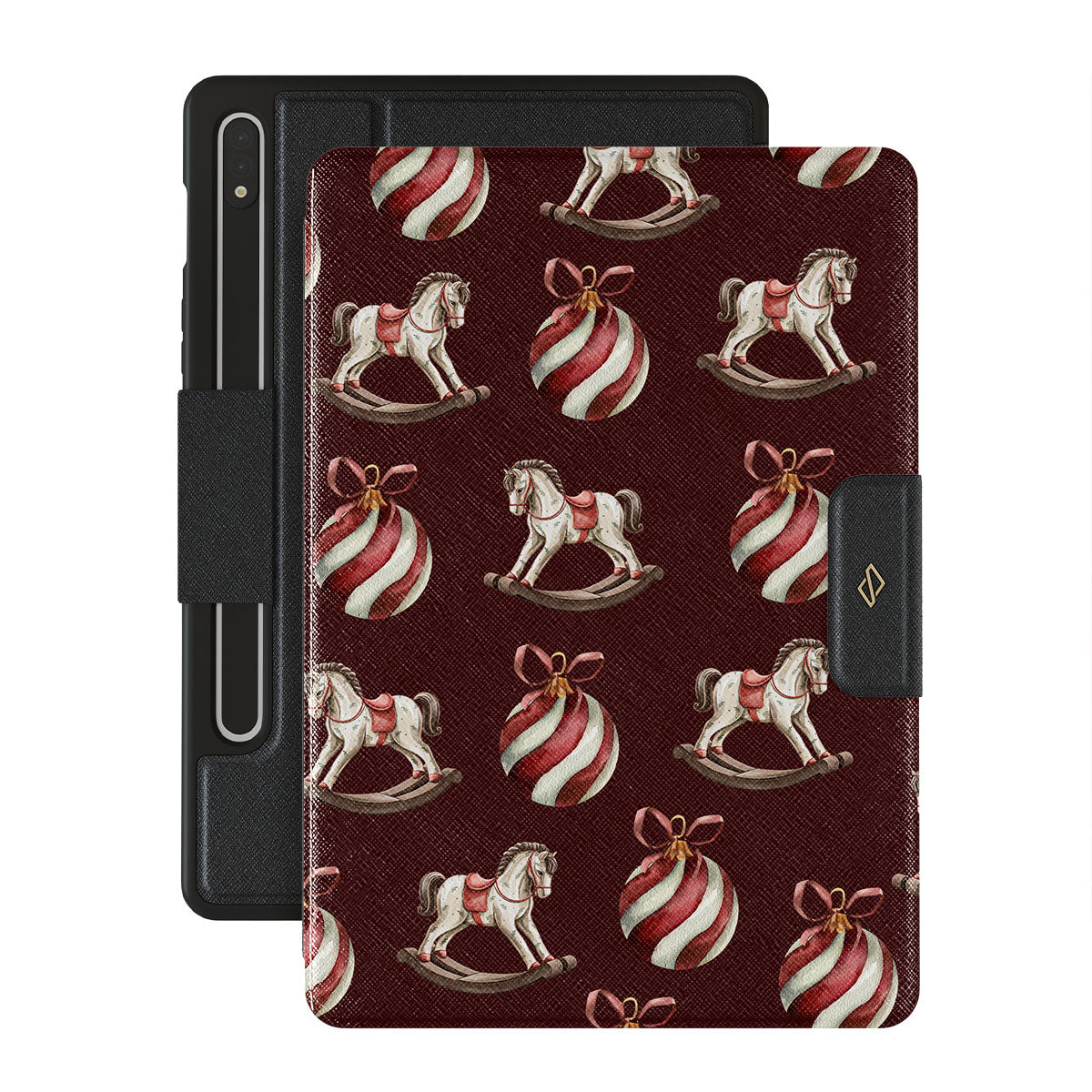 El diseño presenta: caballitos balancín, bolas de Navidad, rojo, decoración navideña.