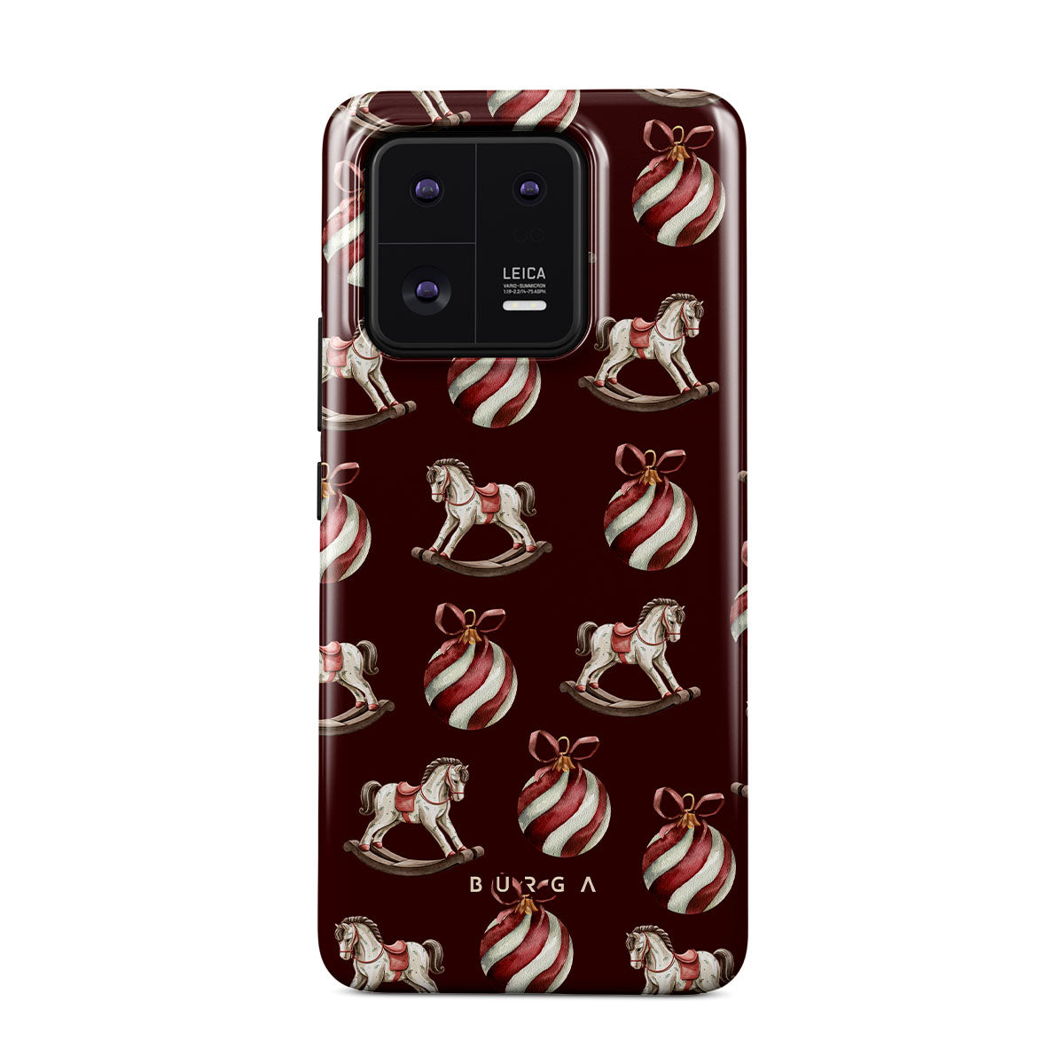 El diseño presenta: caballitos balancín, bolas de Navidad, rojo, decoración navideña.