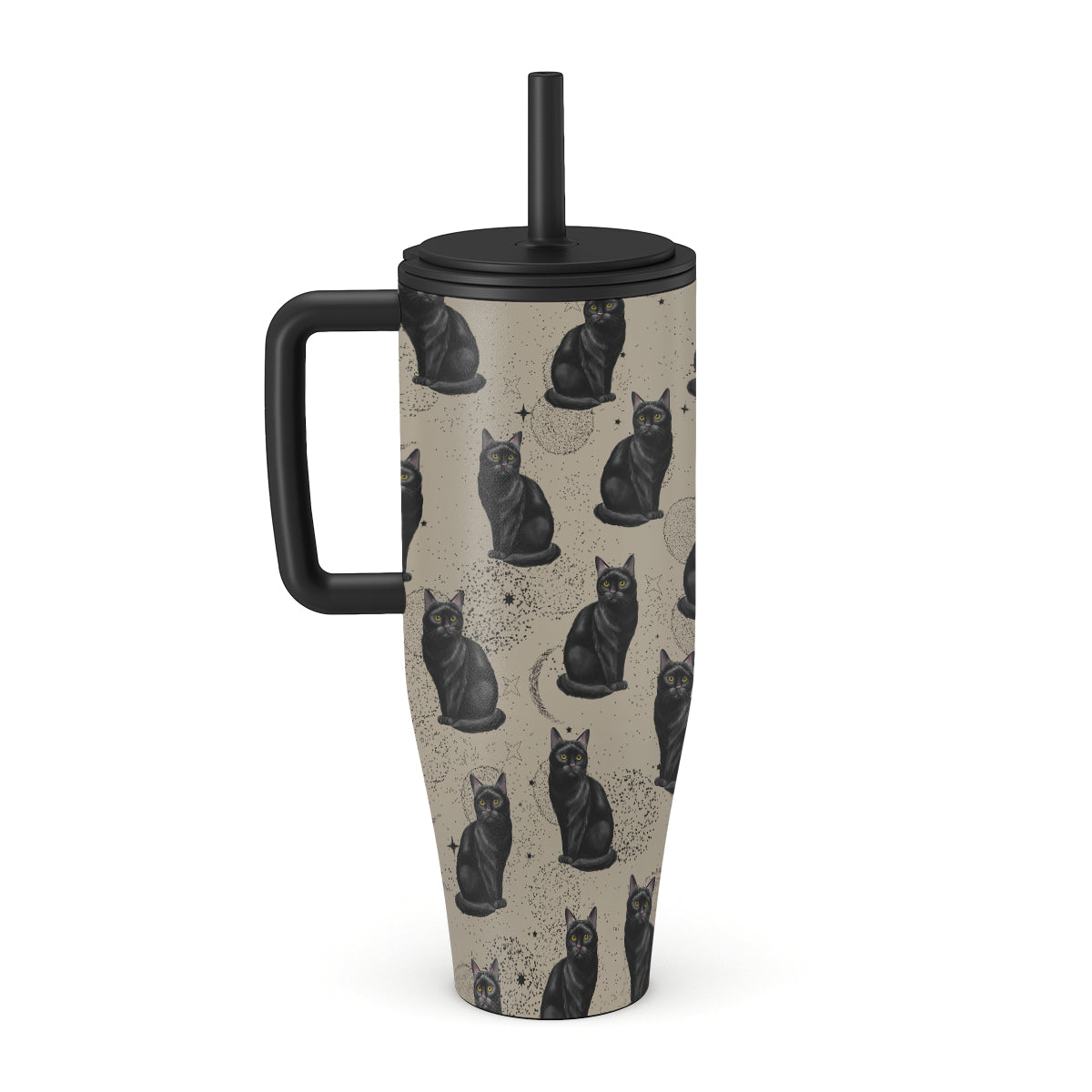En este diseño: gatos negros, símbolos místicos.