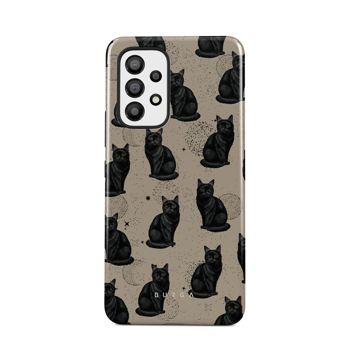 En este diseño: gatos negros, símbolos místicos.
