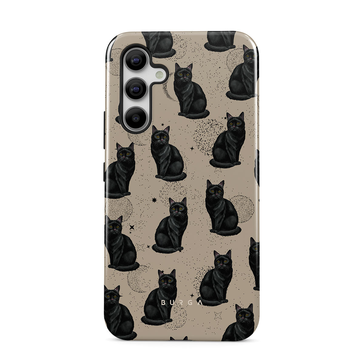 En este diseño: gatos negros, símbolos místicos.