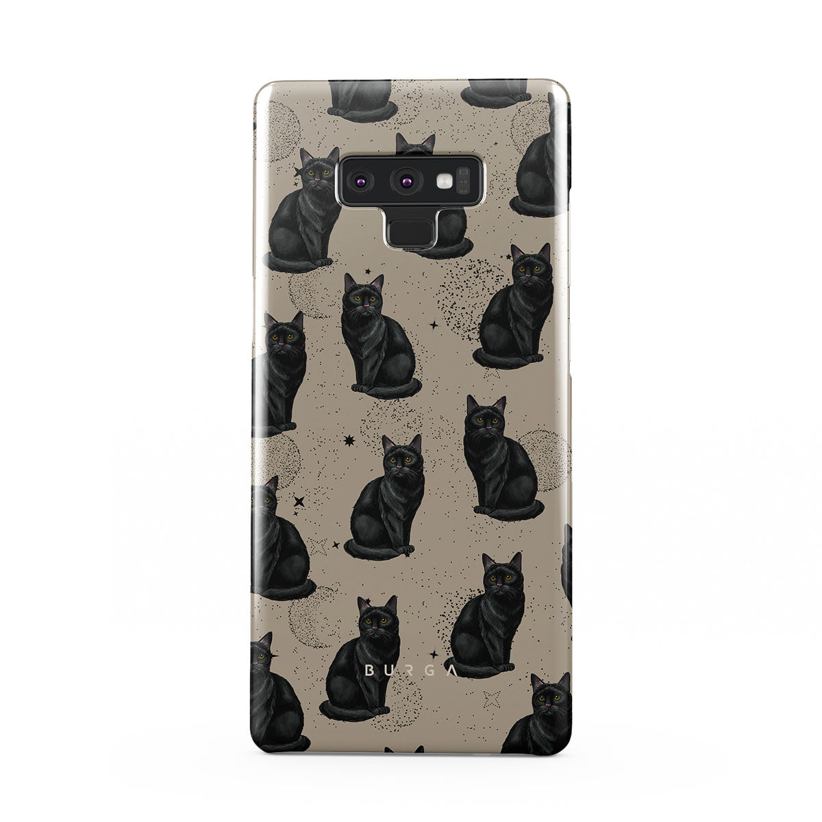 En este diseño: gatos negros, símbolos místicos.