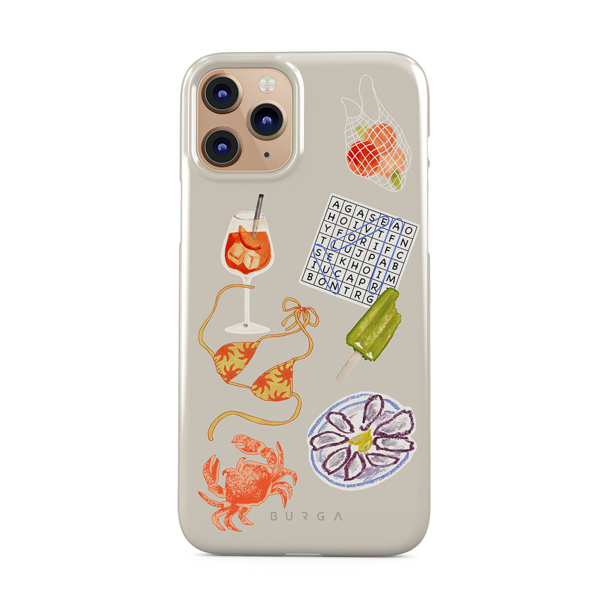 En este diseño: cangrejo, plato de ostras, paleta helada, crucigrama, cóctel spritz, top de bikini, frutas.