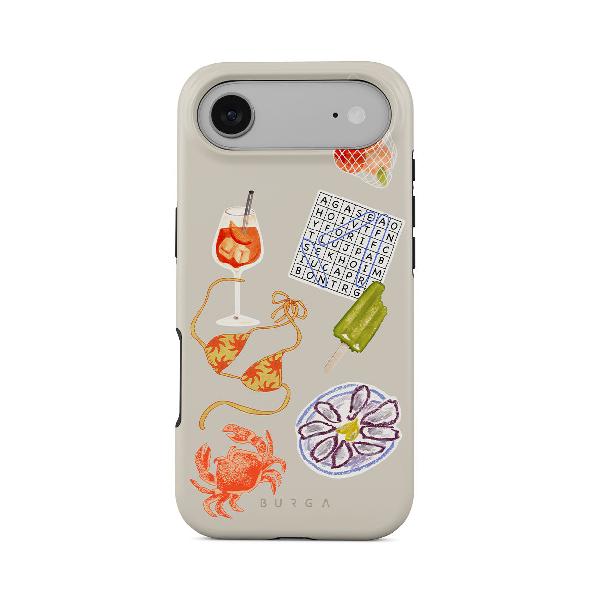 En este diseño: cangrejo, plato de ostras, paleta helada, crucigrama, cóctel spritz, top de bikini, frutas.