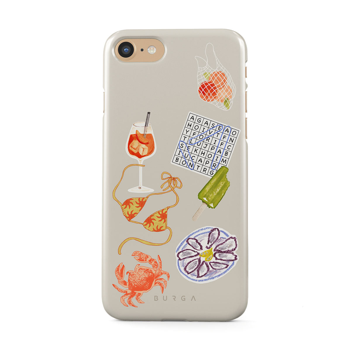 En este diseño: cangrejo, plato de ostras, paleta helada, crucigrama, cóctel spritz, top de bikini, frutas.