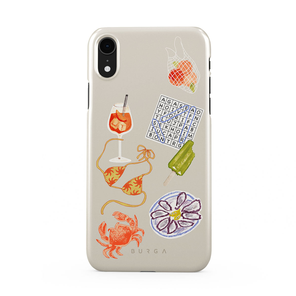 En este diseño: cangrejo, plato de ostras, paleta helada, crucigrama, cóctel spritz, top de bikini, frutas.