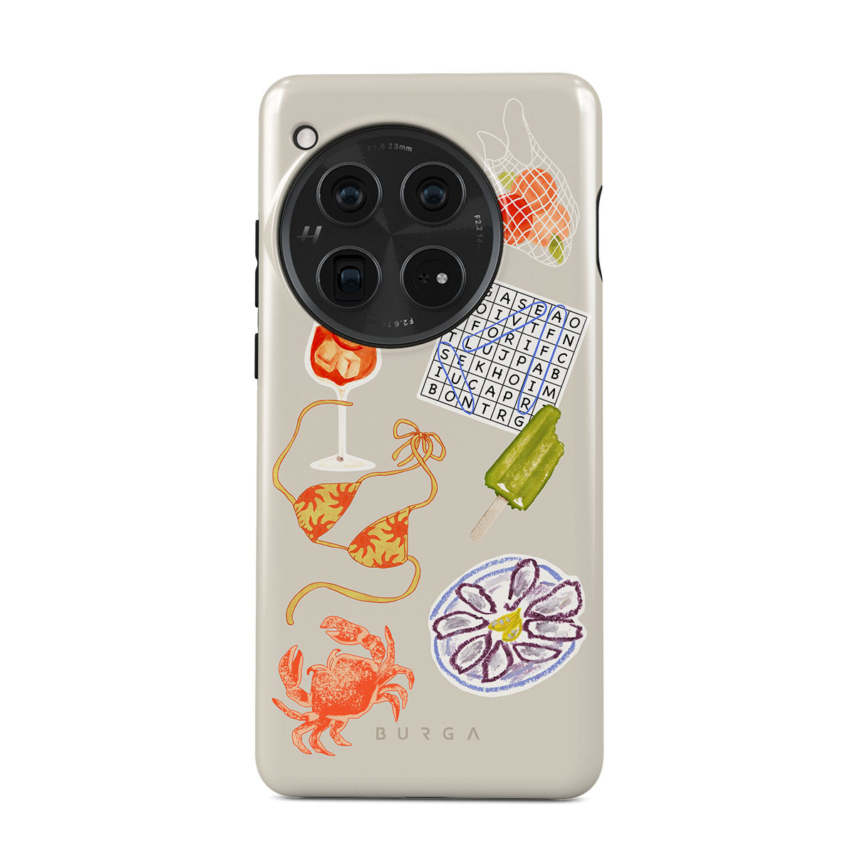 En este diseño: cangrejo, plato de ostras, paleta helada, crucigrama, cóctel spritz, top de bikini, frutas.