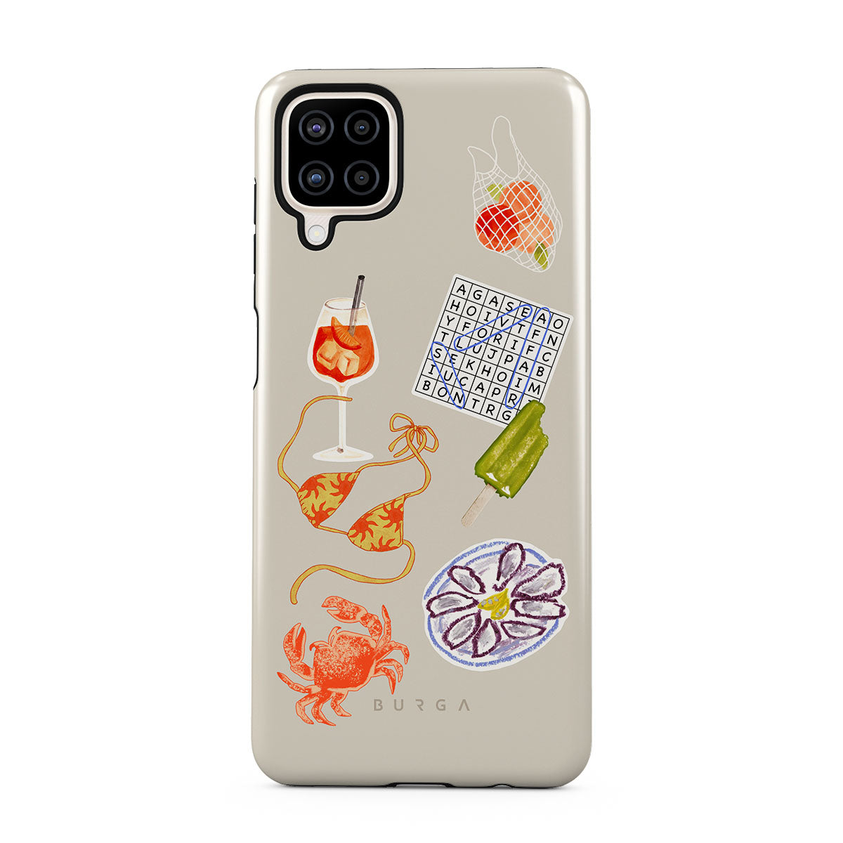 En este diseño: cangrejo, plato de ostras, paleta helada, crucigrama, cóctel spritz, top de bikini, frutas.