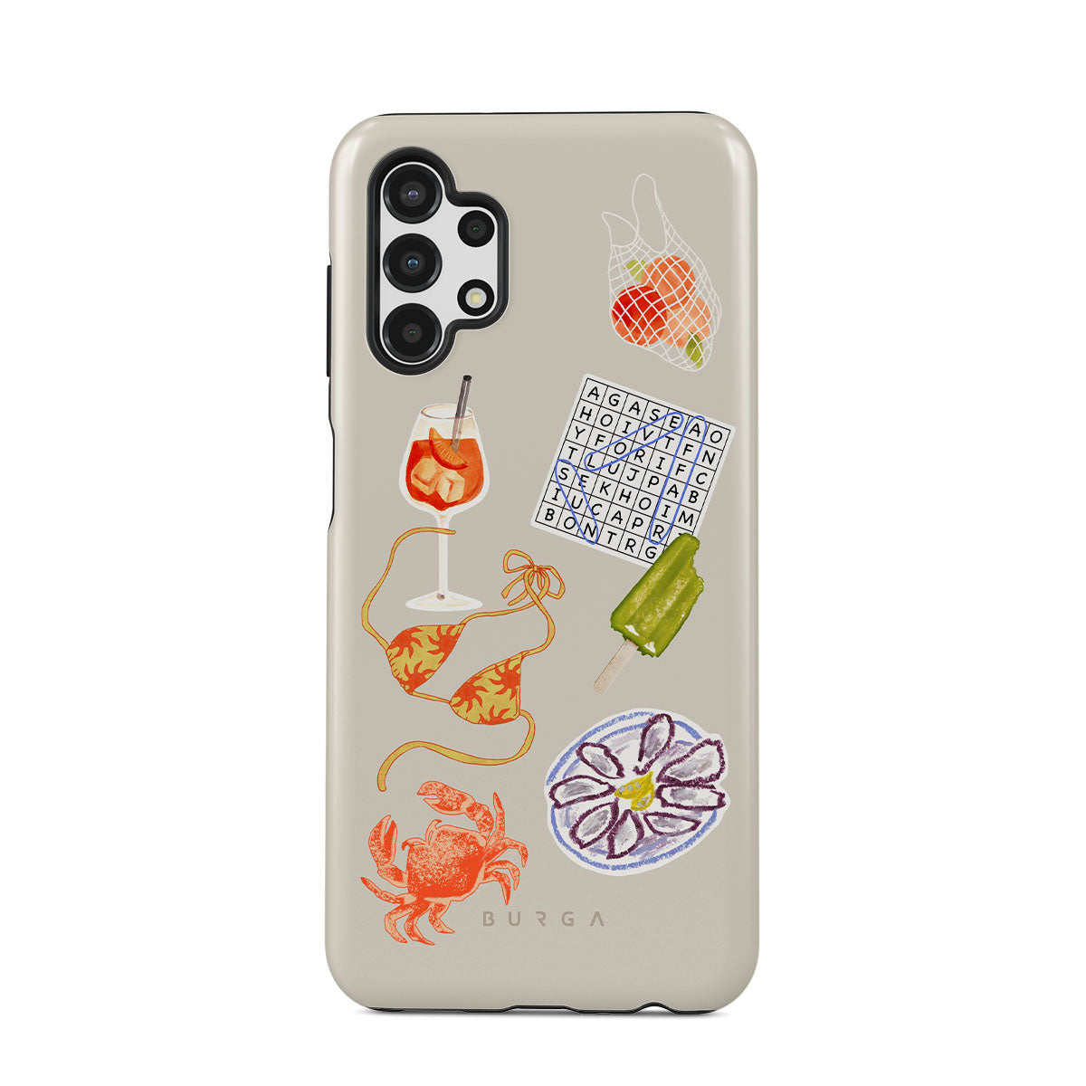 En este diseño: cangrejo, plato de ostras, paleta helada, crucigrama, cóctel spritz, top de bikini, frutas.