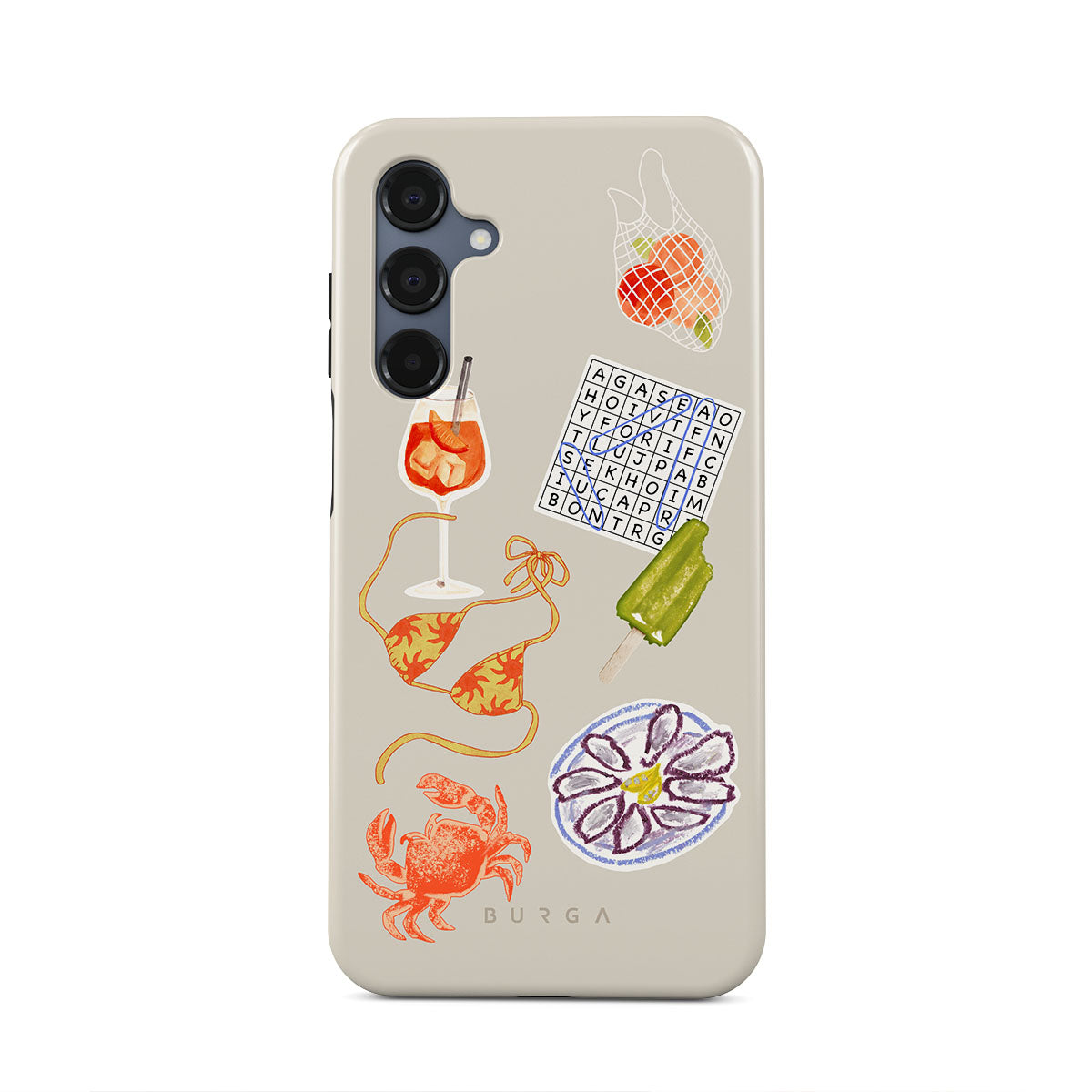 En este diseño: cangrejo, plato de ostras, paleta helada, crucigrama, cóctel spritz, top de bikini, frutas.