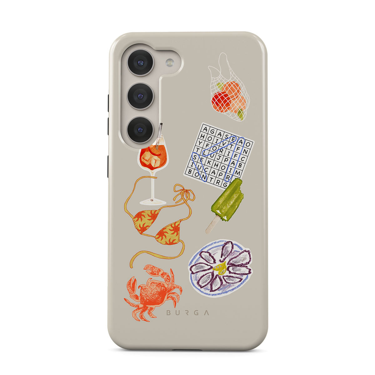 En este diseño: cangrejo, plato de ostras, paleta helada, crucigrama, cóctel spritz, top de bikini, frutas.