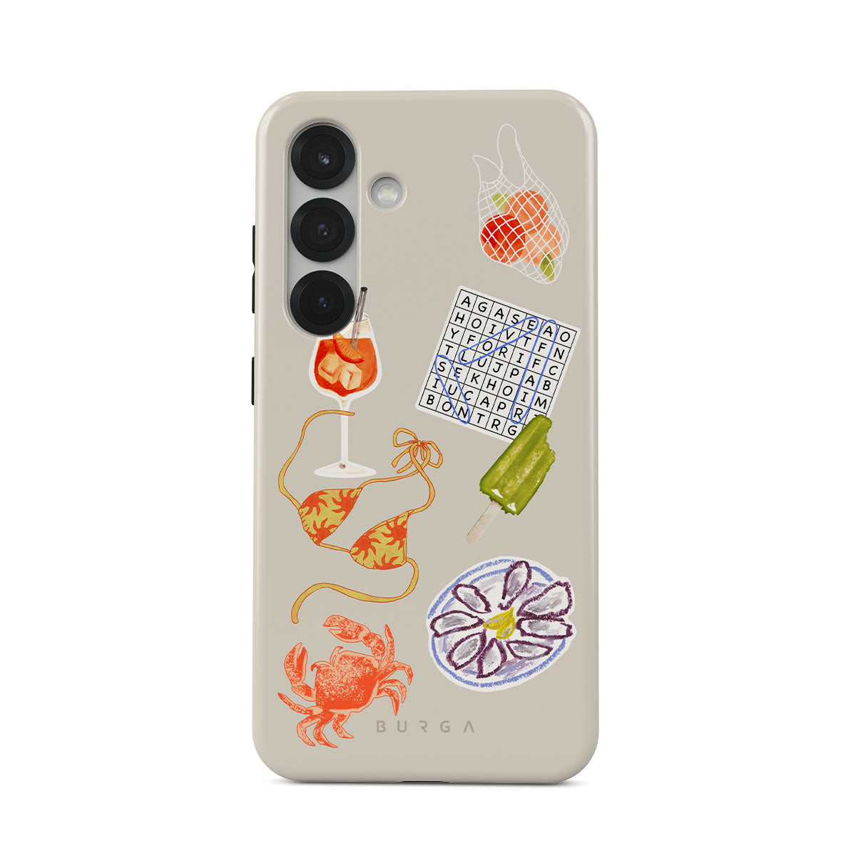 En este diseño: cangrejo, plato de ostras, paleta helada, crucigrama, cóctel spritz, top de bikini, frutas.