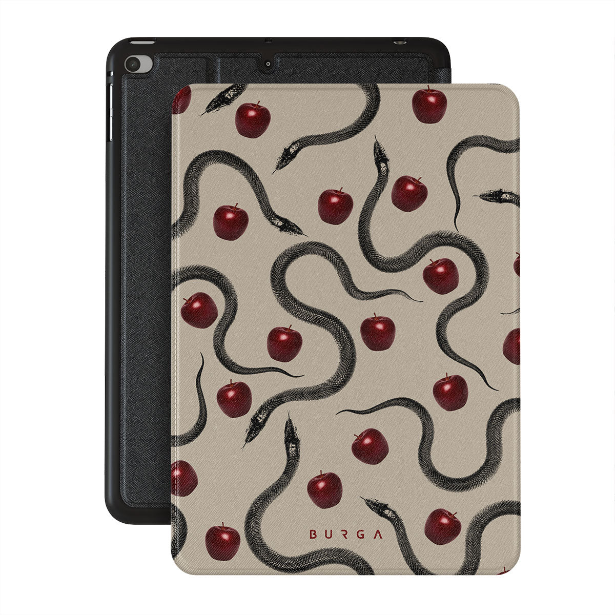 En este diseño: manzanas rojas brillantes, serpientes enroscadas y tonos beis.