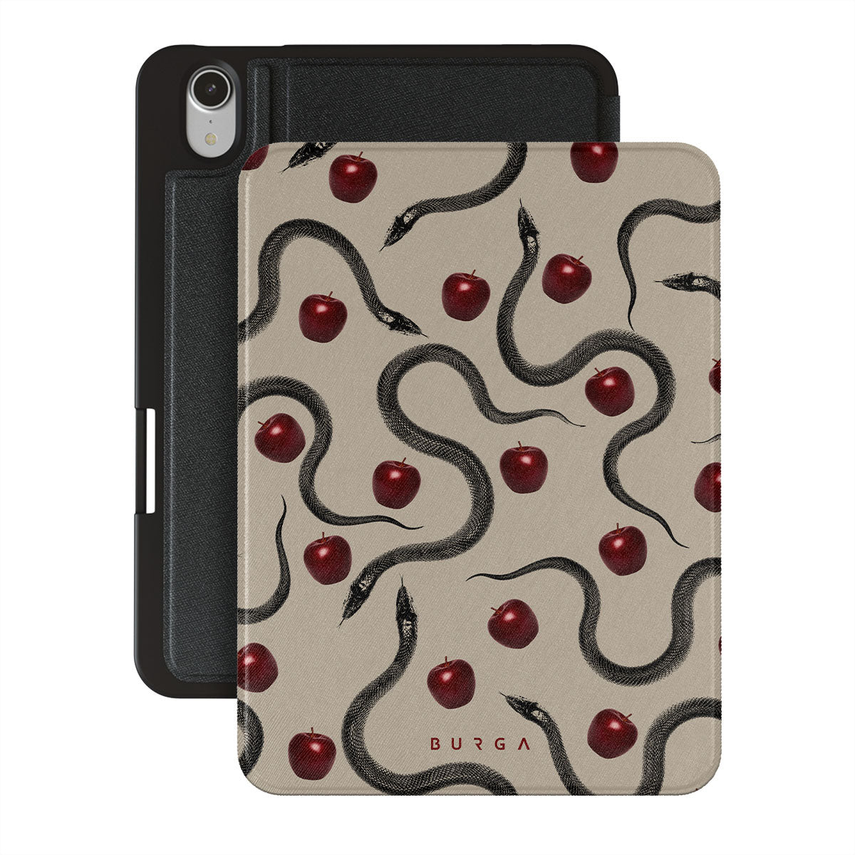 En este diseño: manzanas rojas brillantes, serpientes enroscadas y tonos beis.