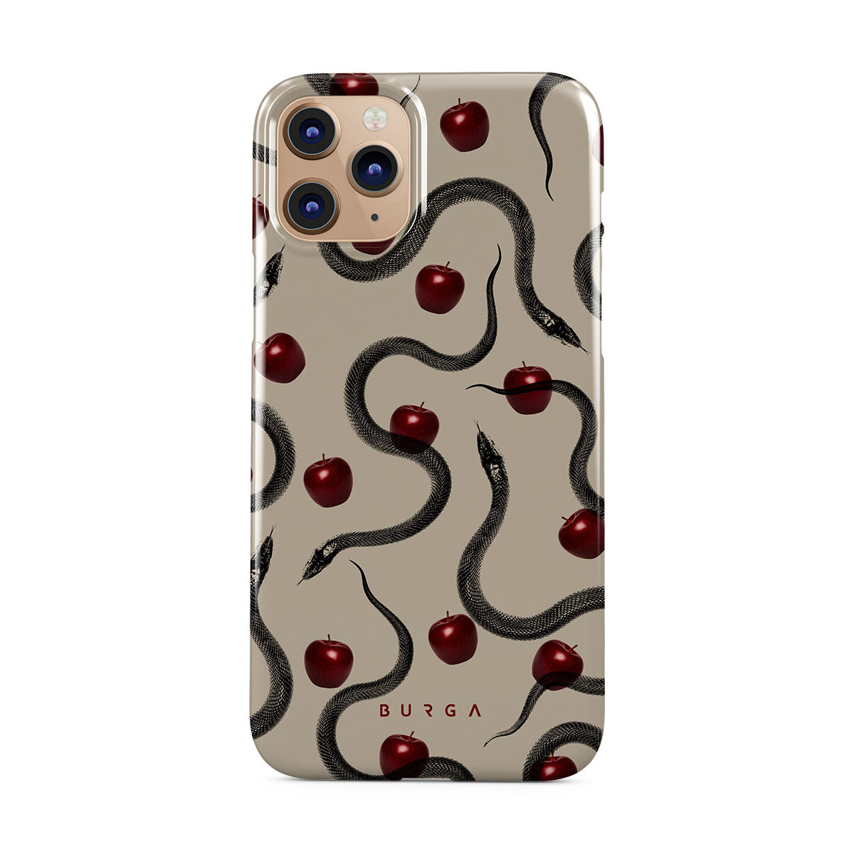 En este diseño: manzanas rojas brillantes, serpientes enroscadas y tonos beis.