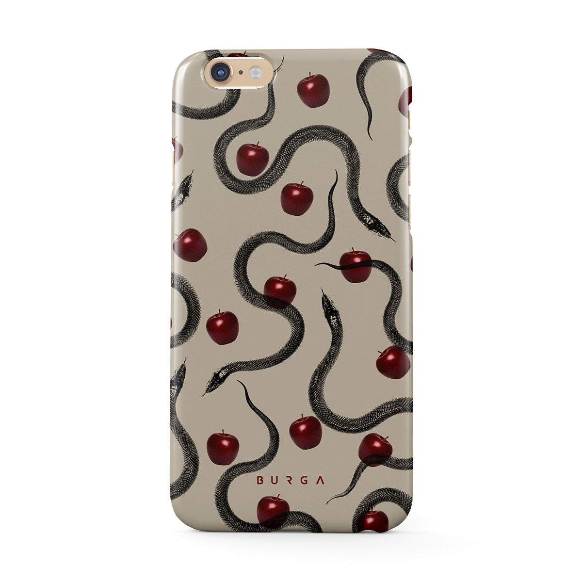 En este diseño: manzanas rojas brillantes, serpientes enroscadas y tonos beis.