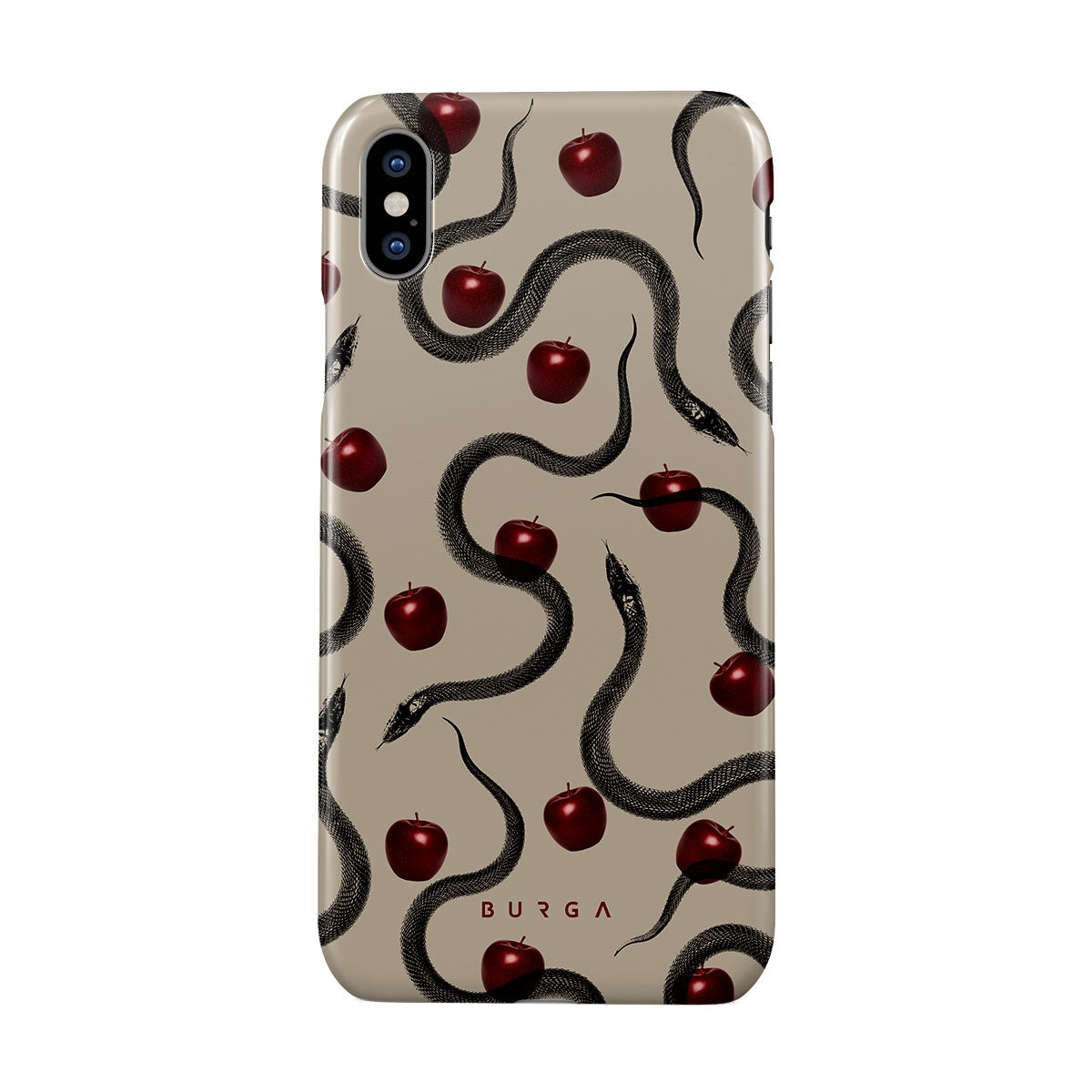 En este diseño: manzanas rojas brillantes, serpientes enroscadas y tonos beis.