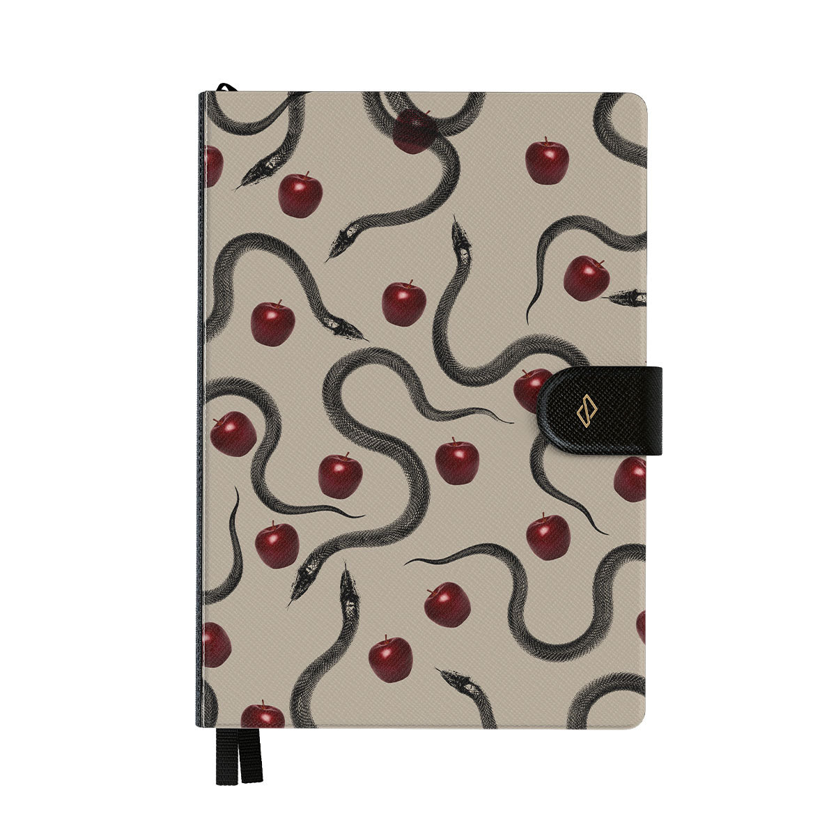 En este diseño: manzanas rojas brillantes, serpientes enroscadas y tonos beis.