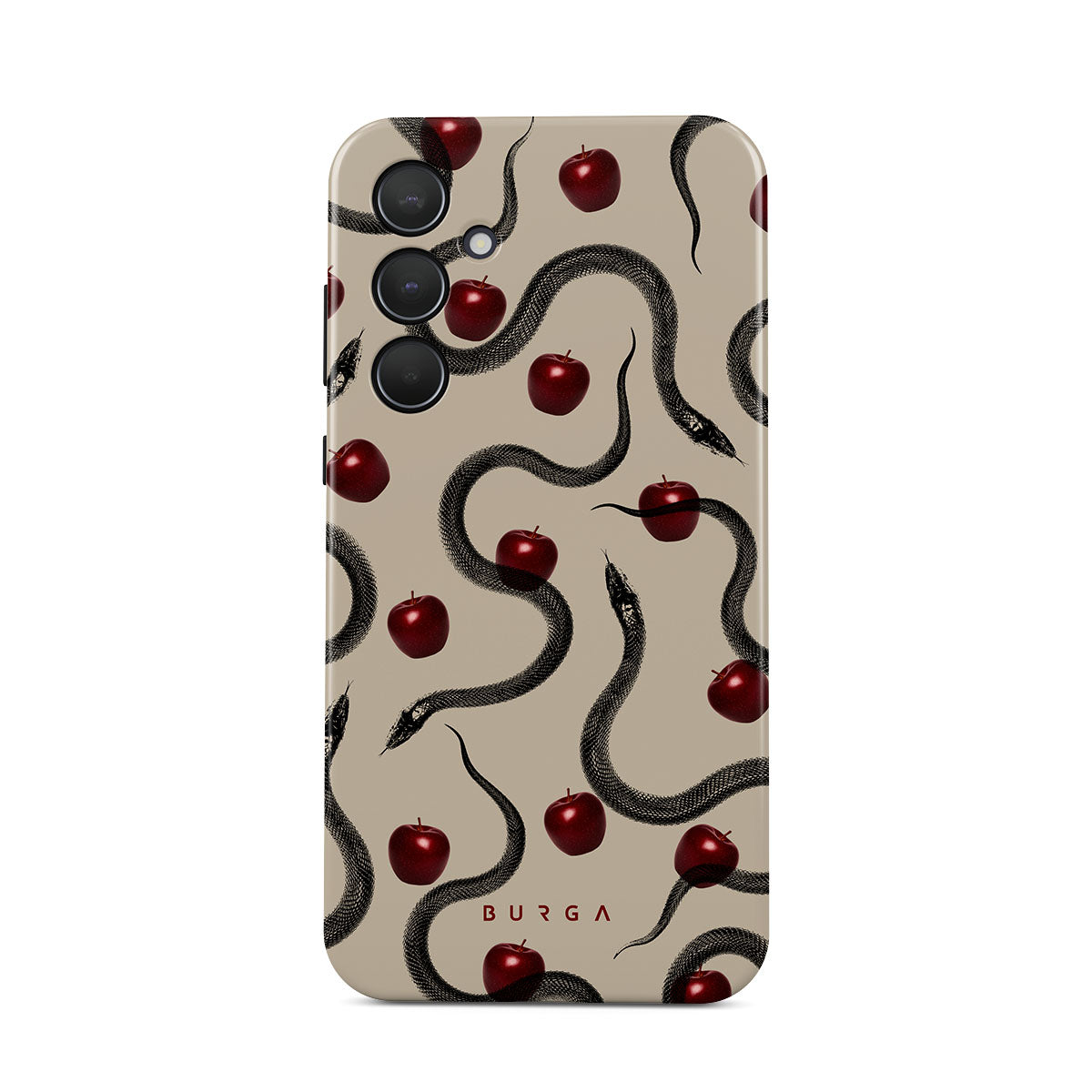 En este diseño: manzanas rojas brillantes, serpientes enroscadas y tonos beis.