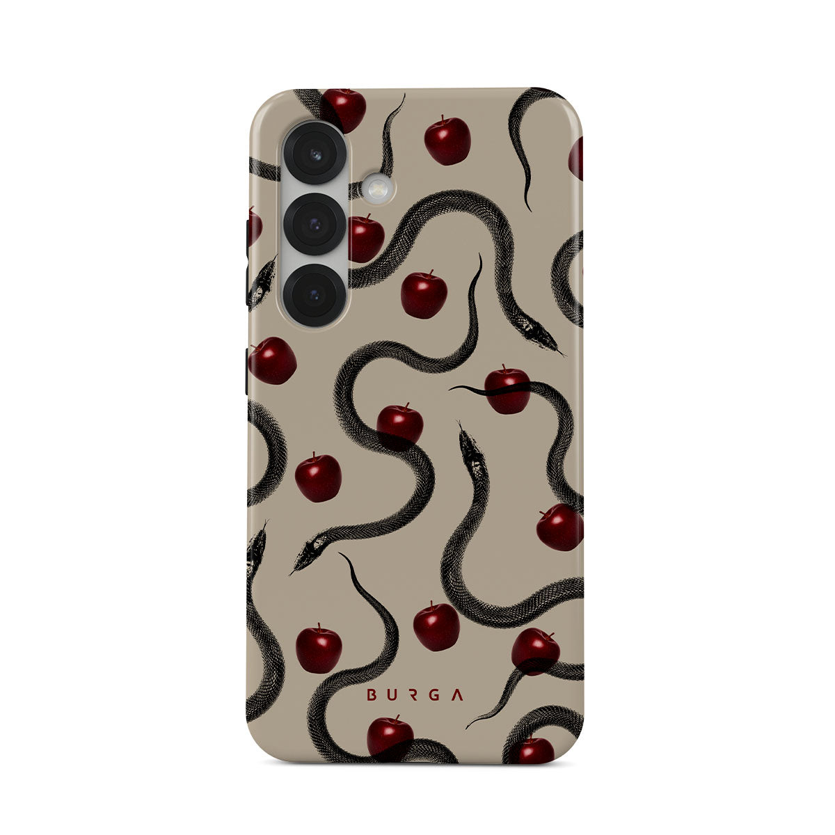 En este diseño: manzanas rojas brillantes, serpientes enroscadas y tonos beis.
