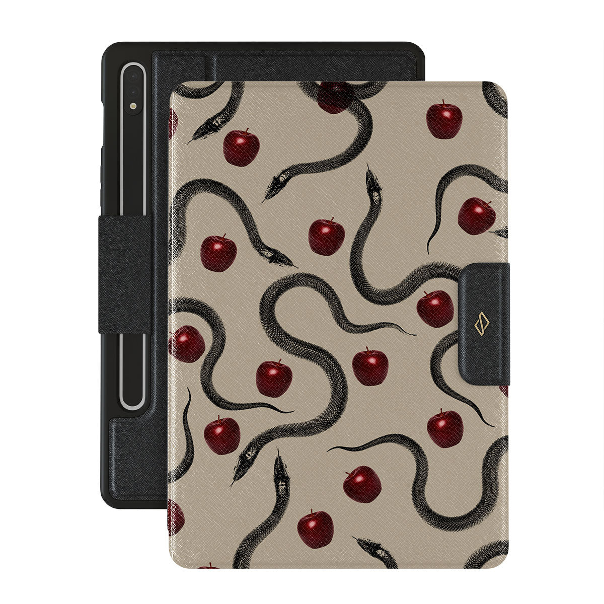 En este diseño: manzanas rojas brillantes, serpientes enroscadas y tonos beis.