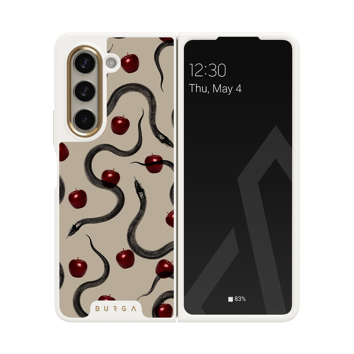 En este diseño: manzanas rojas brillantes, serpientes enroscadas y tonos beis.