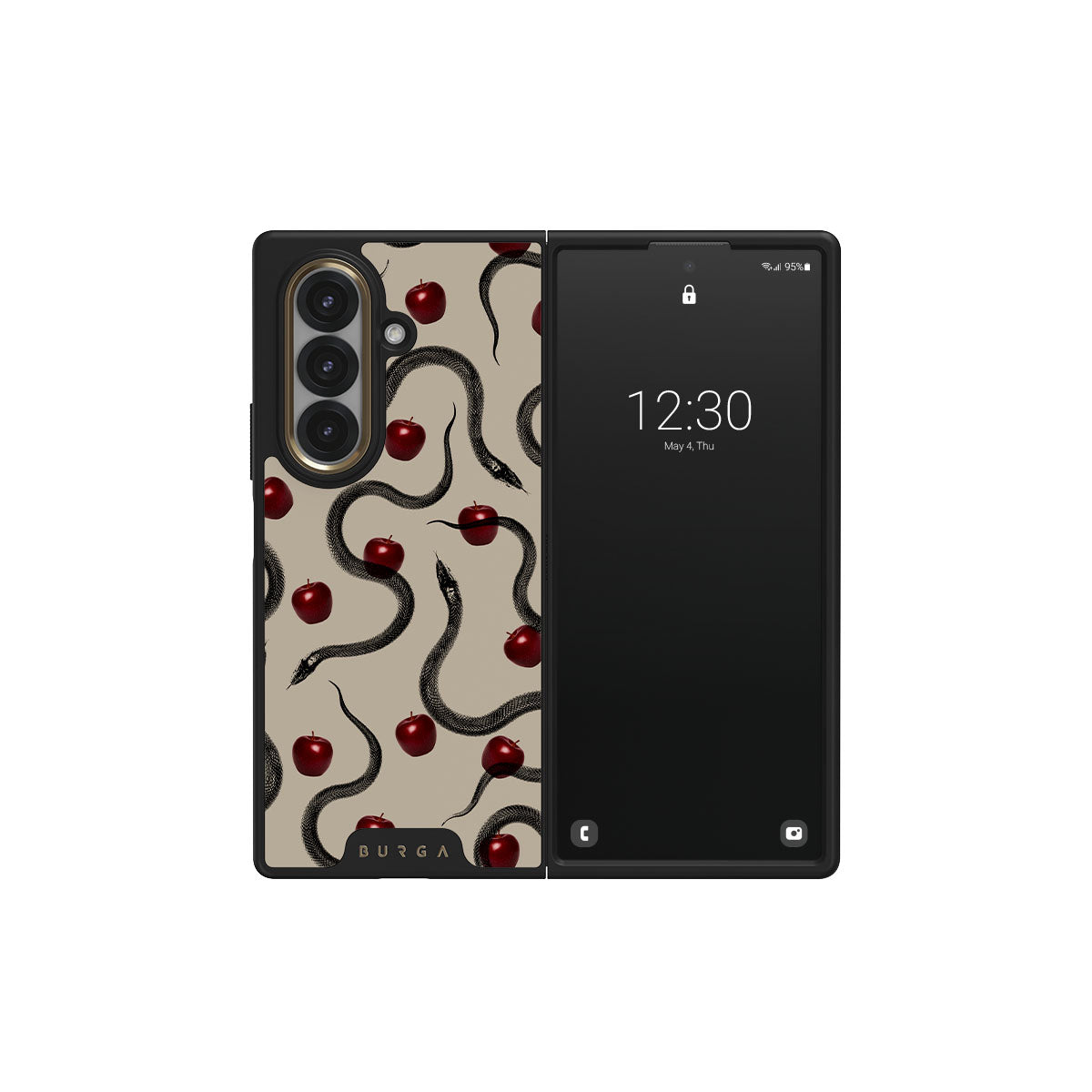 En este diseño: manzanas rojas brillantes, serpientes enroscadas y tonos beis.